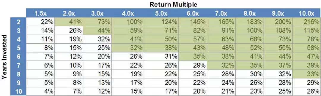 *IRR=內部回報率,可以簡單理解為『考慮折現率的年化收益率』。計算公式略複雜,國外同行做過一個表格可以比較方便的對比不同時間尺度下IRR與基金回報倍數的關係。