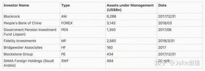 我們可能需要花點時間先簡單了解一下資本市場的宏觀格局,看看全世界可用於投資支配的資金總量與用途。統計顯示,2017年全球的資產管理規模/AUM (Assets Under Management) 為79.2萬億美元 (79.2 trillion USD),這代表了全社會可支配投資的資金體量,依據資金使用的社會意義、投資回報的預期、投資標的、風險偏好程度等不同被分成不同的類別,我列出了幾種主要的類別,並附上了不同類別下一些如雷貫耳的代表性機構和資管規模: