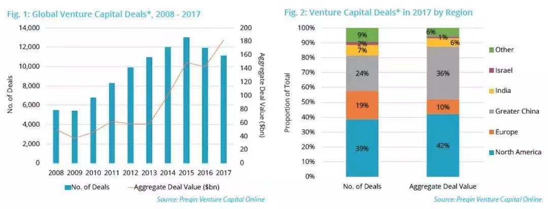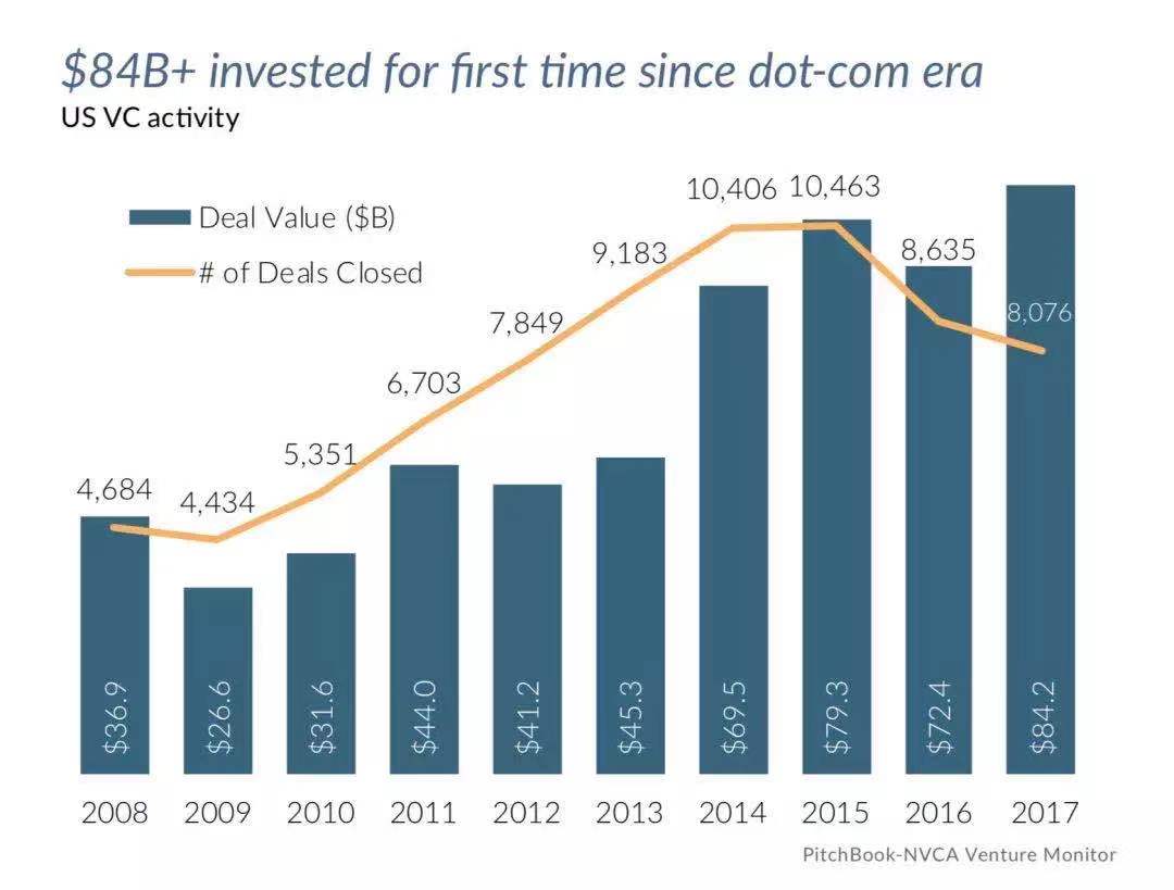 相比之下,VC的錢其實少的可以忽略不計.. 據美國風險投資協會NVCA的統計,2017年美國市場上的VC共計投出了840億美元的資金(需要注意的是,這裏指的是實際投出去的錢,而非VC的AUM),從投資的資金規模來講是自dot-com泡沫以來的新高。