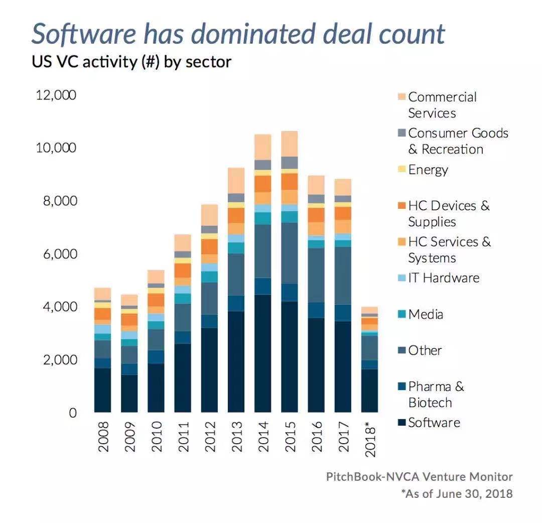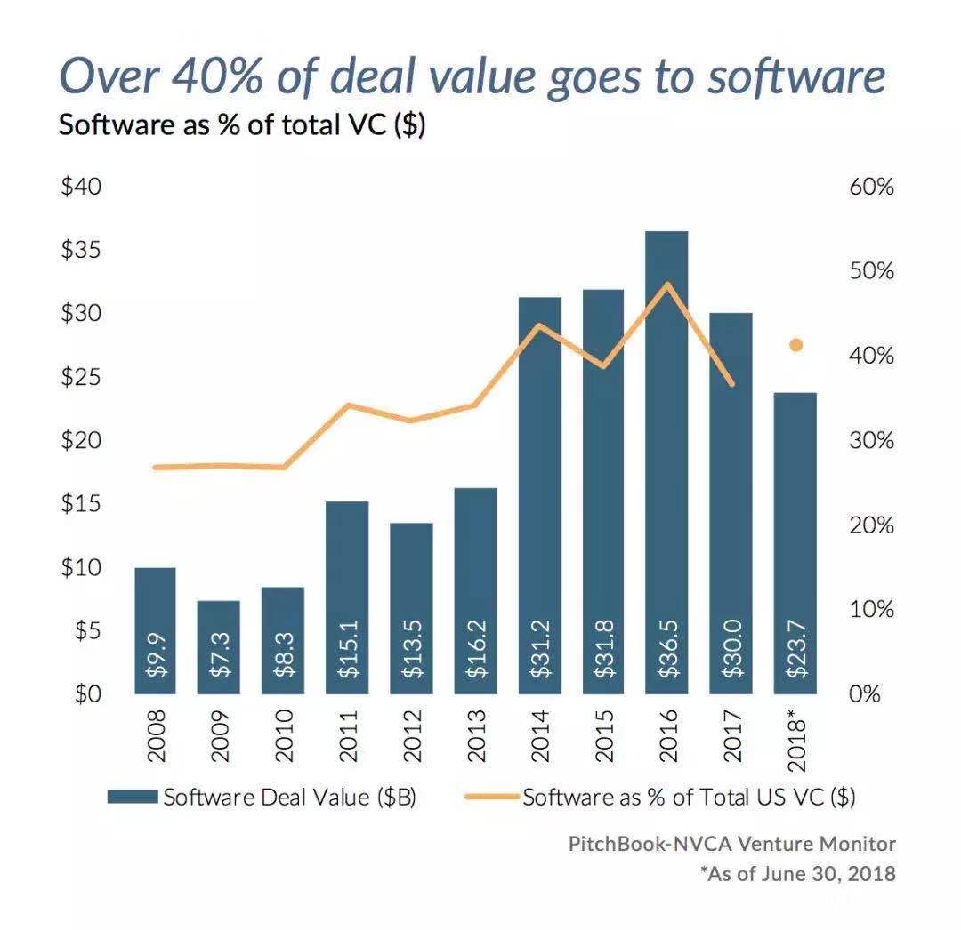 womenjixucankaomeiguoshichangdeshuju。yifangmian,meiguoshichangshiyigechengshudeshichang,youzugoudeshujukeyongyufenxi,lingyifangmian,zhongmeishichangtiliangxiangdang,suiranjieduanxingbutong,danshizaiquanqiuhuaqushibeijingxia,meiguoshichangxianzhuangduiyuzhongguoshichangdeweilaihaishifeichangyoucankaoyiyide。meiguoshichangdeVC常年會把40%左右的錢投資於『軟件』這個品類,這裏所指的軟件涵蓋消費互聯網/Internet(例如Uber, Airbnb, Lyft等)約占25%的比重,以及企業軟件/Enterprise Software(包括SaaS應用軟件、IT基礎軟件、網絡安全、雲計算、大數據、AI等)約占15%的比重,這兩部分加在一起是40%。這個Software也就是Marc Andreessen所講的『Software is eating the world』中的Software。其實這與中國的情況非常類似,VC會將大部分錢都投資於『世界的數字化』。