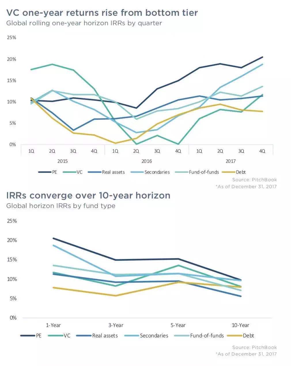 如果說有一個指標能讓VC行業『去神秘化』的話,我想這個指標一定是『VC行業的平均回報率』。全球VC行業的平均一年滾動IRR*大約是在10%-15%的水平(IRR是一個衡量基金回報率的指標,下文略有解釋)。也就是說,一個還不錯的,十到十二年存續期的美元基金通常大致能做到3-5倍的回報,如果我們站在10年的時間尺度來看的話,VC的回報與PE、債、母基金、二級市場的投資回報率甚至是趨同的,IRR都集中在10%左右。